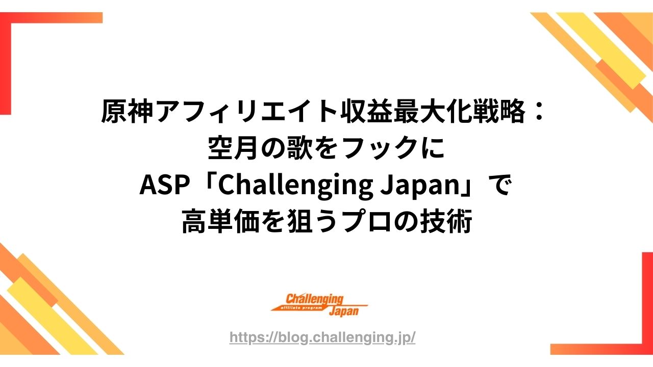 「原神」および「空月の歌」をテーマにしたゲームアフィリエイトで、月間収益を飛躍的に向上させるための戦略的ガイド。オープンワールドRPGという広大な市場におけるSEOキーワード選定から、ユーザーの課金心理を突いた訴求、成約率(CVR)を極限まで高めるライティング術をプロの視点で網羅しています。さらに、他社ASPを凌駕する高条件案件を保有する、ゲーム特化型ASP「Challenging Japan(チャレンジング・ジャパン)」への登録メリットと、収益最大化のための運用フローを徹底解説。競合ひしめくゲームブログ界で、確固たる地位と収益基盤を築くためのノウハウを凝縮しました。